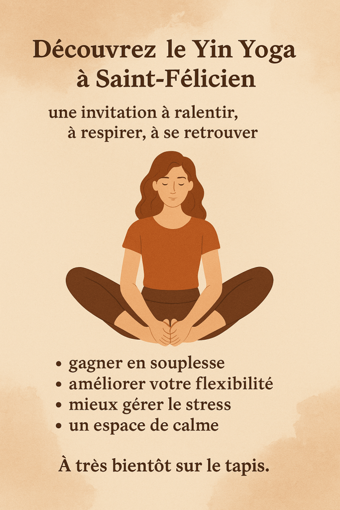 Très bientôt, j’aurai le plaisir d’offrir des cours de Yin Yoga ici même, à Saint-Félicien. Que vous soyez curieux, fatigué, stressé ou simplement en quête d’un mieux-être durable, je vous invite à venir découvrir cette approche douce, profonde et régénératrice.